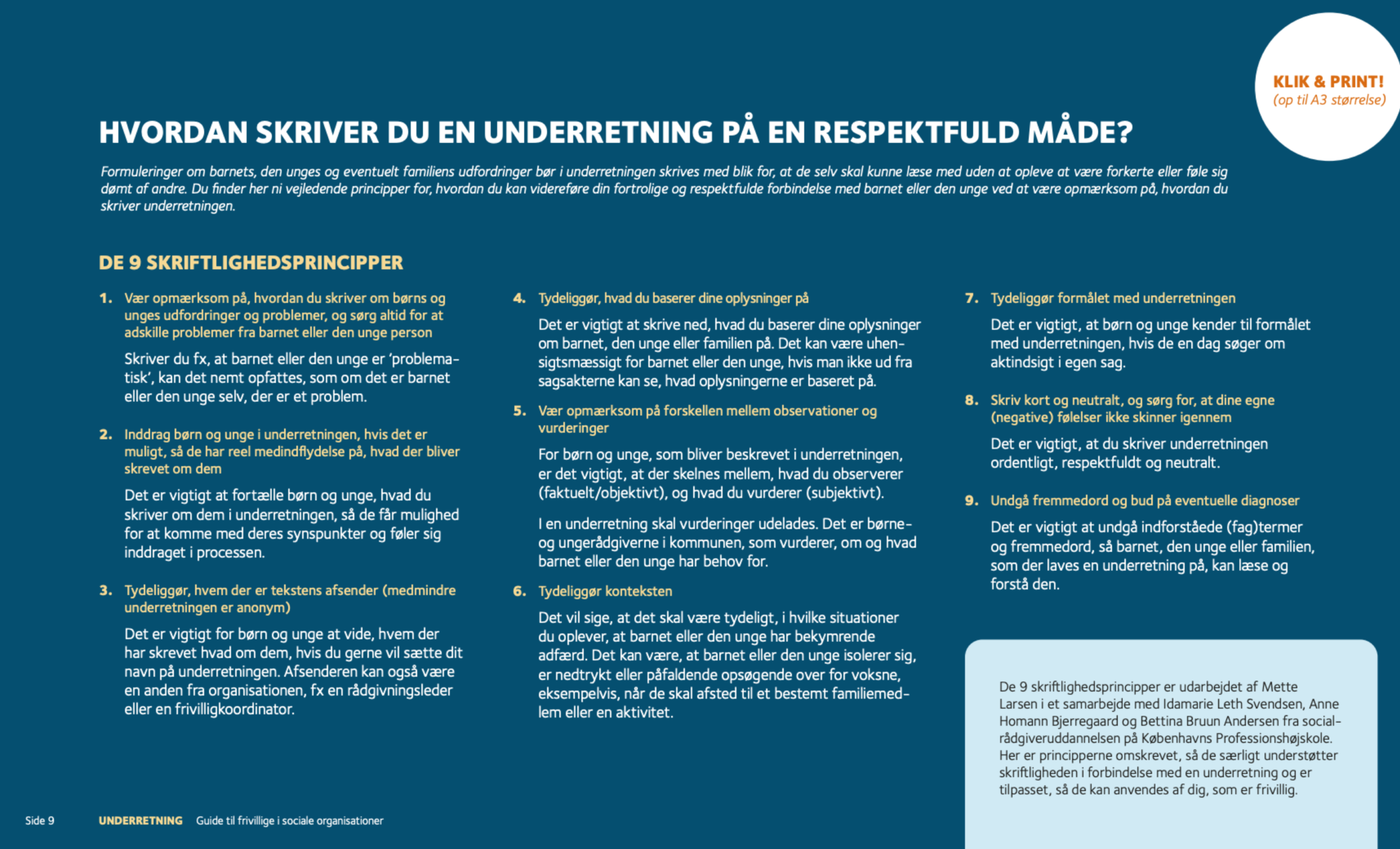 I Danmark har Socialstyrelsen laget veiledere til helsesykepleiere og til frivillige om hvordan sende underretninger tilkommunen. I veilederne beskrives det hvordan underretninger kan skrives på en respektfull måte og hvordan barn kan involveres i skrivingen. Kanskje disse kan inspirere Norge?